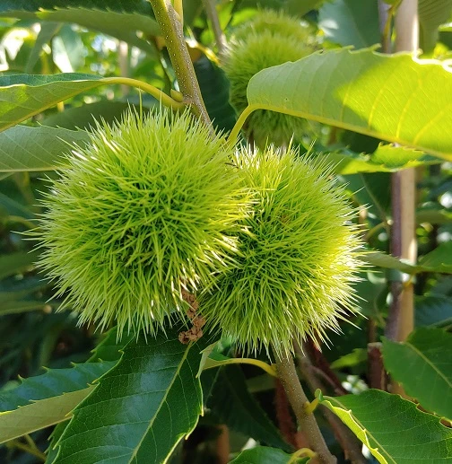 Zwei Esskastanien-Sorten auf einem Stamm. Duo-Obstbäume haben den Vorteil, dass auf kleinem Raum zwei verschiedene Sorten angebaut werden können. Die beiden Sorten befruchten sich gegenseitig, sodass ein hoher Ertrag gewährleistet ist.