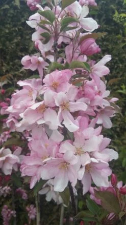 Ein wunderschöner Zierapfel. Er wächst aufrecht und schmal und wird nur ca. 150 cm breit. Im Mai entwickeln sich aus den rosa farbenen Knospen viele kleine weiß-rosa bis rote Blüten. Die Sorte ist bekannt für die sehr üppige Blüte.